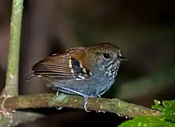 - Belmonte-Lopes, R., Bravo, G.A., Bornschein, M.R., Maurício, G.N., Pie, M.R. & Brumfield, R.T. 2012. Genetic and morphological data support placement of Myrmotherula gularis (Spix) in the monotypic genus Rhopias Cabanis and Heine (Aves: Passeriformes: Thamnophilidae). Zootaxa 3451: 1–16. Preview Full article (PDF)Reference page.