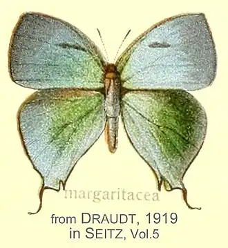 - Thecla margaritacea Draudt, 1919: 755, pl.153b; Bridges, 1994: 283.